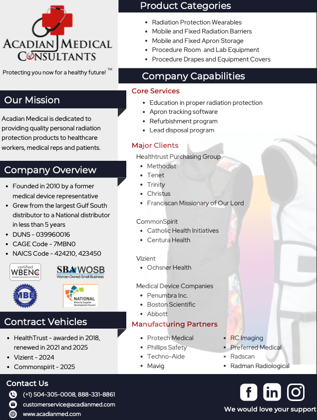 For more than 14 years, Acadian Medical Consultants has been dedicated to creating a unique consultative experience in the personal radiation protection industry. Our consultants provide the highest quality domestic made aprons and diagnostic imaging accessories. We are happy to offer a range of supplementary services to complement our primary mission of value-added customer care; these services include lead apron disposal program, cloud-based apron tracking software, apron recovery and ASRT accredited CEU educational classes.